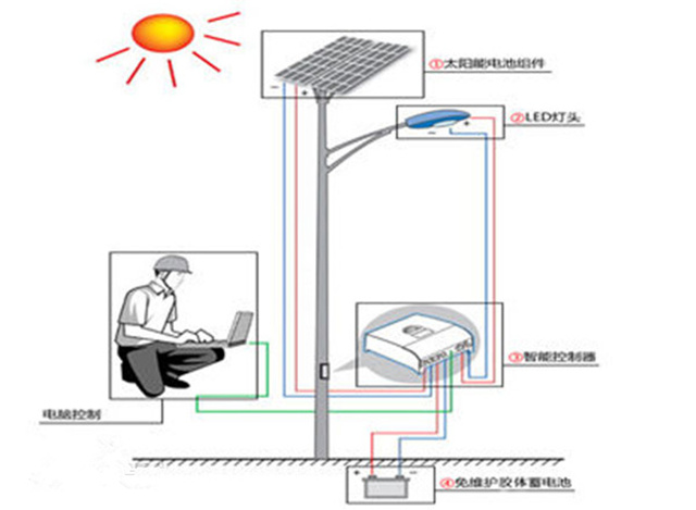 太陽能路燈系統由光伏太陽能板、太陽能路燈燈頭、智能控制器(光控及計時器、控制逆變器)、蓄電池和燈桿五個部分組成。